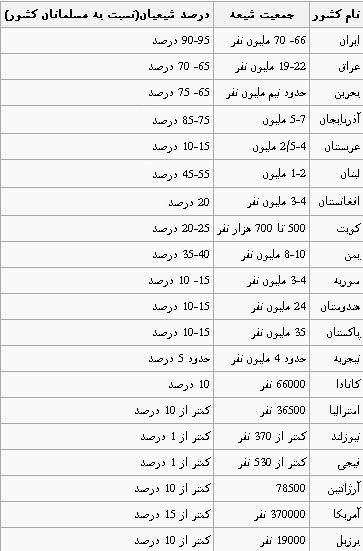 بر اساس آمار، 90 درصد از جمعیت 70 میلیونی ایران را شیعیان تشکیل می دهند. این تعداد بیش از40 درصد کل جمعیت شیعیان دنیا است . کشورهای دیگری که دارای اکثریت جمعیت شیعه و یا اقلیت های شیعی قابل توجه هستند، عمدتا در اطراف ایران قرار دارند . عراق، آذربایجان، بحرین، عربستان سعودی، افغانستان، پاکستان و ...بهترین نمونه ها را به دست می دهند .[۱]