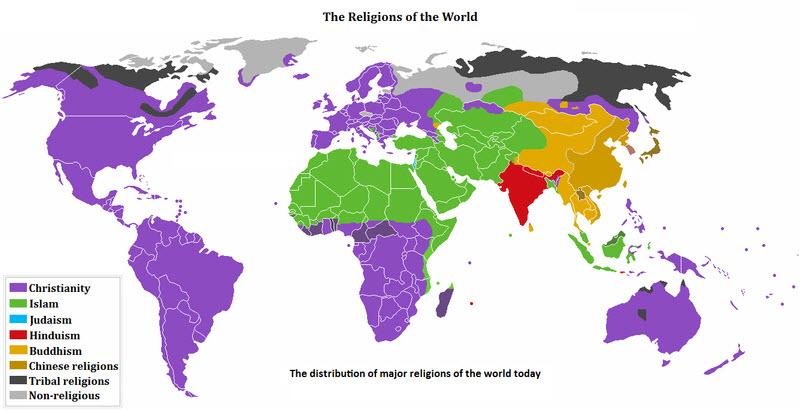 1- در سال 2010 میلادی، آیین مسیحیت با گسترش در ۳۳٪ نوع بشر، بیشترین گسترش را روی کرة خاکی دارد، و پس از آن اسلام با گسترش ۲۱٪، بیدینی با گسترش ۱۶٪ و آیین هندو با گسترش ۱۴٪ قرار دارند: