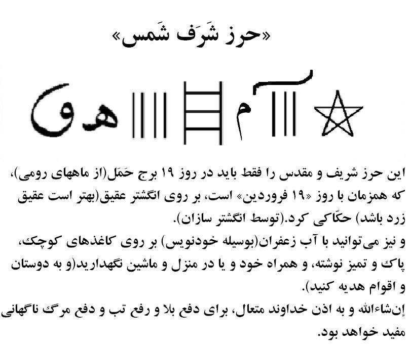 یکی از دعاها و حِرزهای بسیار مهم، «حِرز شرف شمس» است که برای اثر بخشی آن، فقط باید در یک روز از سال آن را نوشت، و آنهم روز 19 فروردین است.